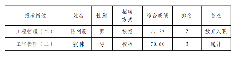 因报考温州市交通发展集团有限公司工程管理(二)岗位总成绩排名第2名的考生自愿放弃考察及录用资格,根据《温州市交通发展集团有限公司2023届高校毕业生校园招聘公告》,该岗位按总成绩从高分到低分进行递补,现由排名第3名的考生按规定递补参加体检考察,调整后名单如下: