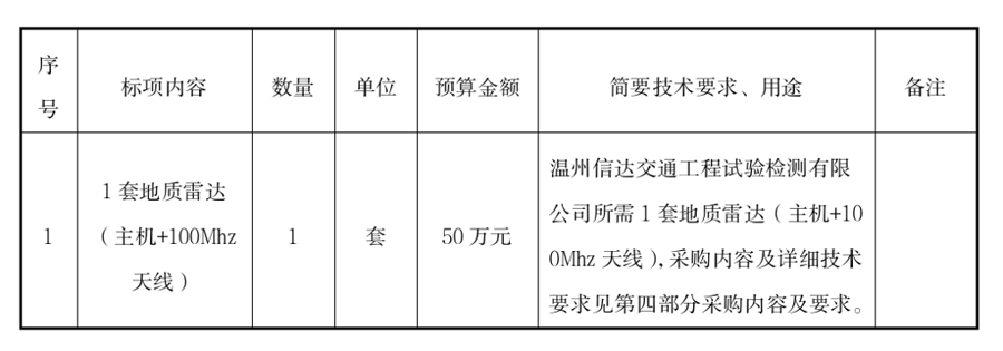 根据《温州市市属国有企业采购管理办法》等有关规定,大地工程咨询有限公司受温州信达交通工程试验检测有限公司委托,就所需1套地质雷达(主机+100Mhz天线)项目以公开招标的方式进行采购,欢迎国内合格的投标供应商前来投标。