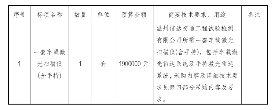 根据《温州市市属国有企业采购管理办法》温国资委〔2024〕51号、《温州市交通发展集团有限公司国有企业采购管理办法(试行)》温交发〔2020〕149号等有关规定,温州市远景交通工程管理有限公司受温州信达交通工程试验检测有限公司委托,就所需1套车载激光扫描仪(含手持)项目以公开招标的方式进行采购,欢迎国内合格的投标供应商前来投标。