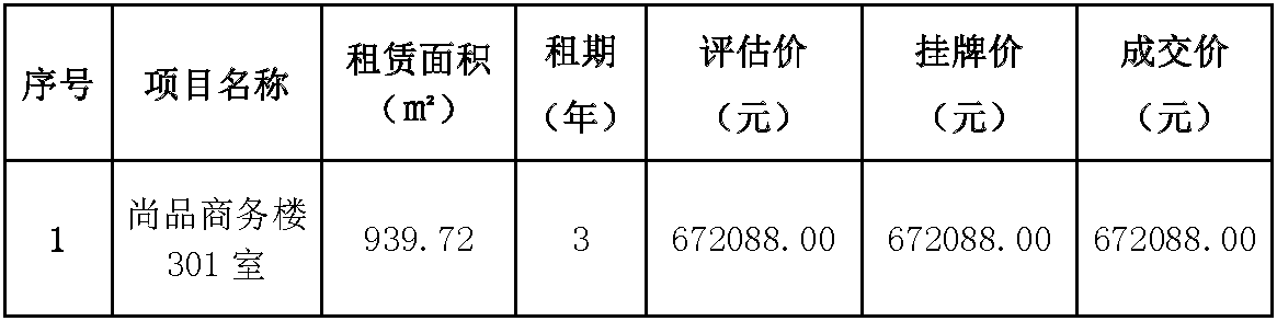 温州市交通发展集团有限公司下属温州房地产开发股份有限公司就所属尚品商务楼301室资产项目于2021年3月23日发布招租公告,现将招租结果公示如下: