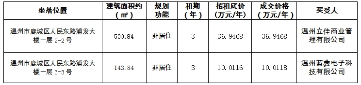 温州房地产开发股份有限公司就温州市鹿城区人民东路浦发大楼一层2-2号、3-3号2宗非居住用房三年租赁权于2024年1月4日至1月17日进行公开招租,经评估机构评估、委托产权交易中心拍卖及公开竞价并按相关程序审批,已完成公开拍卖,现将拍卖结果公示如下: