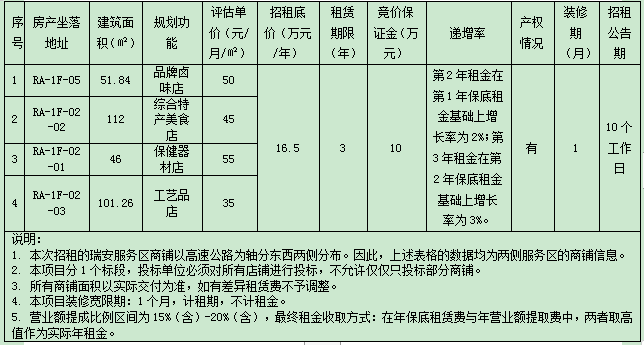 伟德国际victor1946经营公司关于甬莞高速公路瑞安服务区2处商铺(RA-1F-05、RA-1F-02)合并三年租赁权交易公告