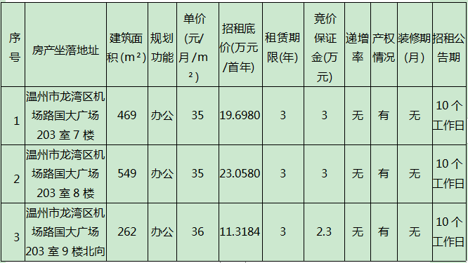伟德国际victor1946经营公司关于温州市龙湾区机场路国大广场203室7楼、8楼、9楼北向3宗办公房三年租赁权交易公告