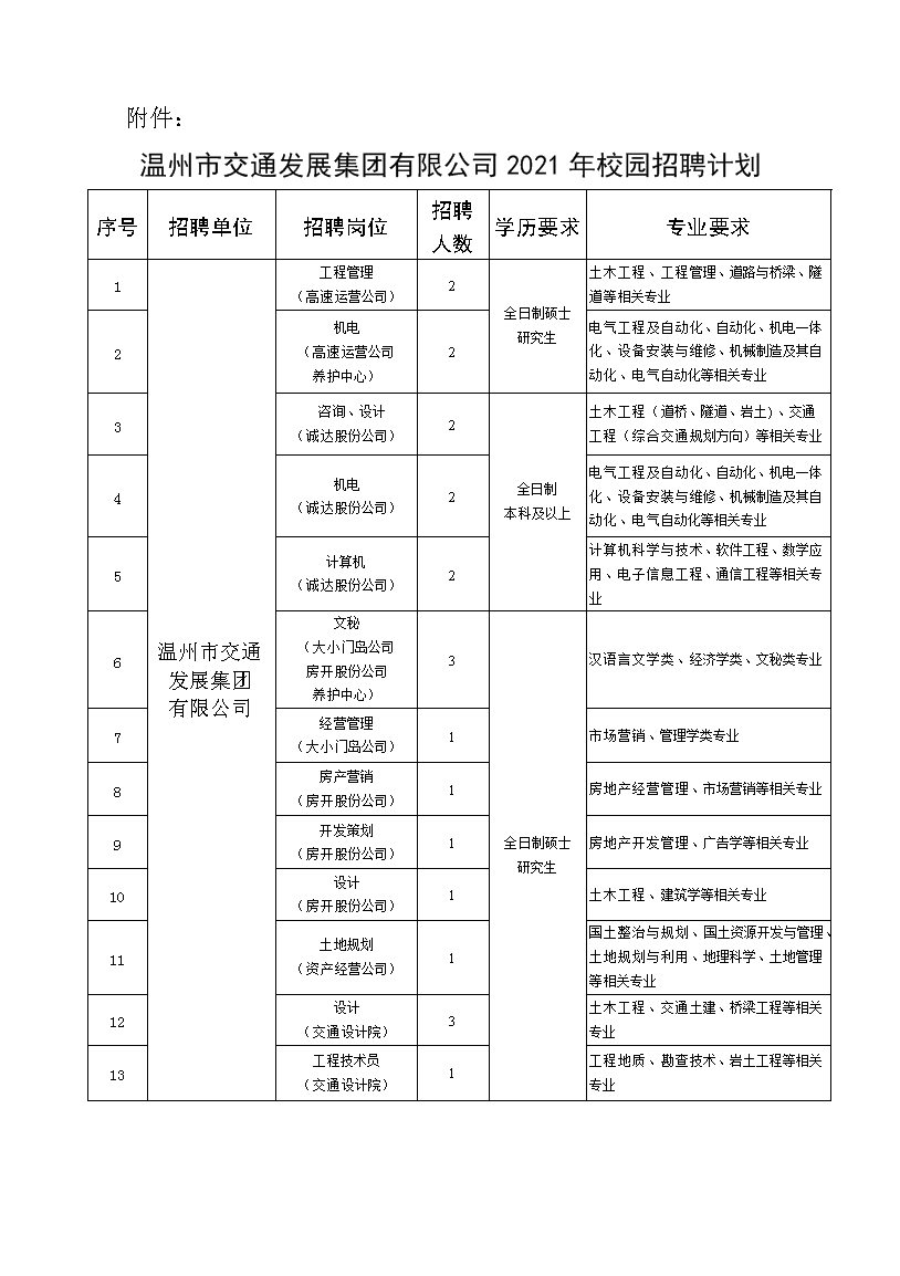 温州市交通发展集团有限公司2021年校园招聘公告