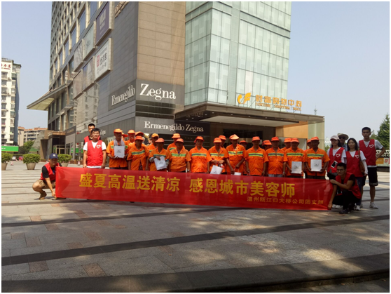 为助力温州“大建大美”,2017年8月6日上午,瓯江口大桥公司团支部在车站大道财富中心广场开展了“盛夏高温送清凉·感恩城市美容师”志愿者活动,为环卫工人送上了矿泉水、风油精、沐浴露等慰问品,并用一小时亲身体验了环卫工人的工作。