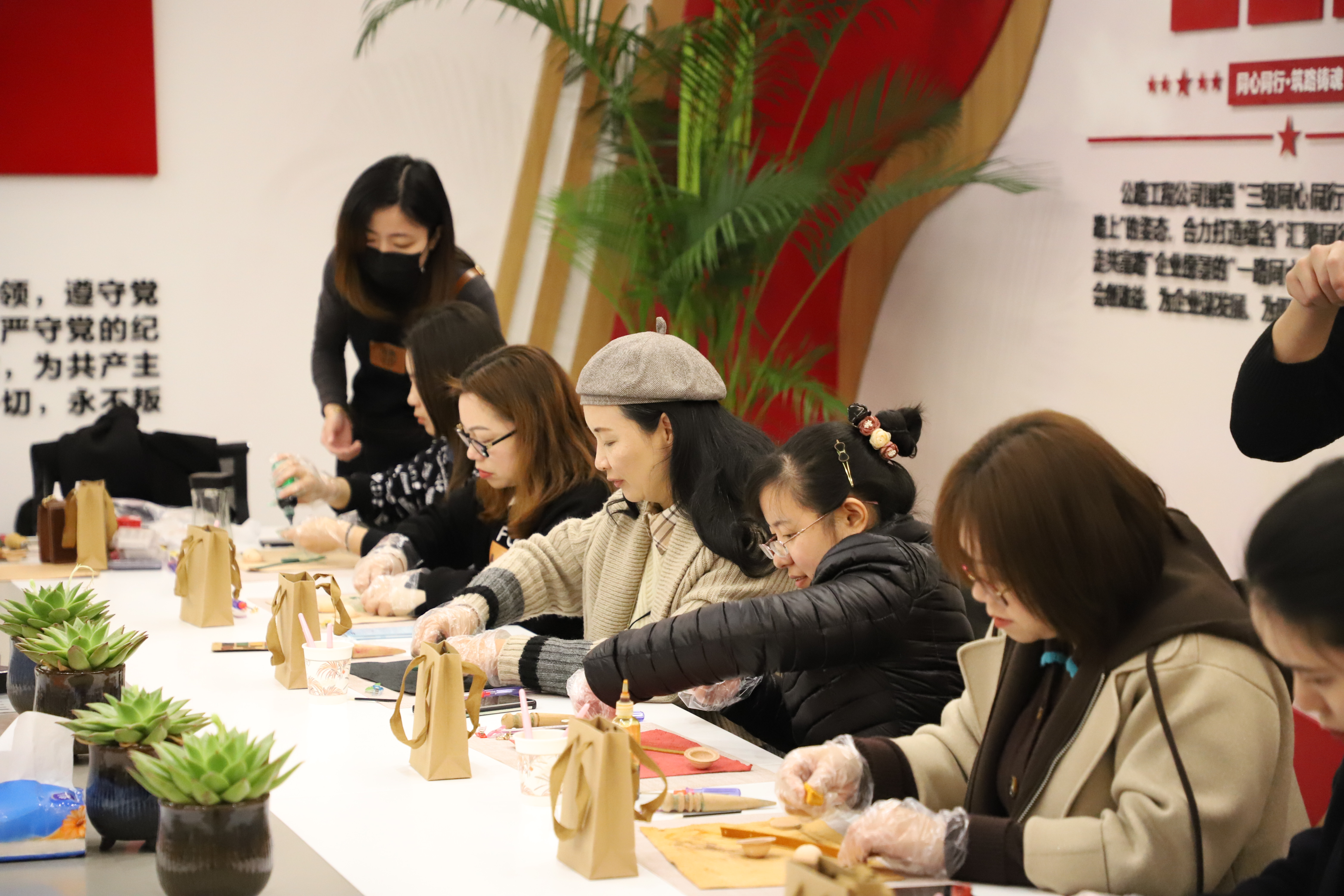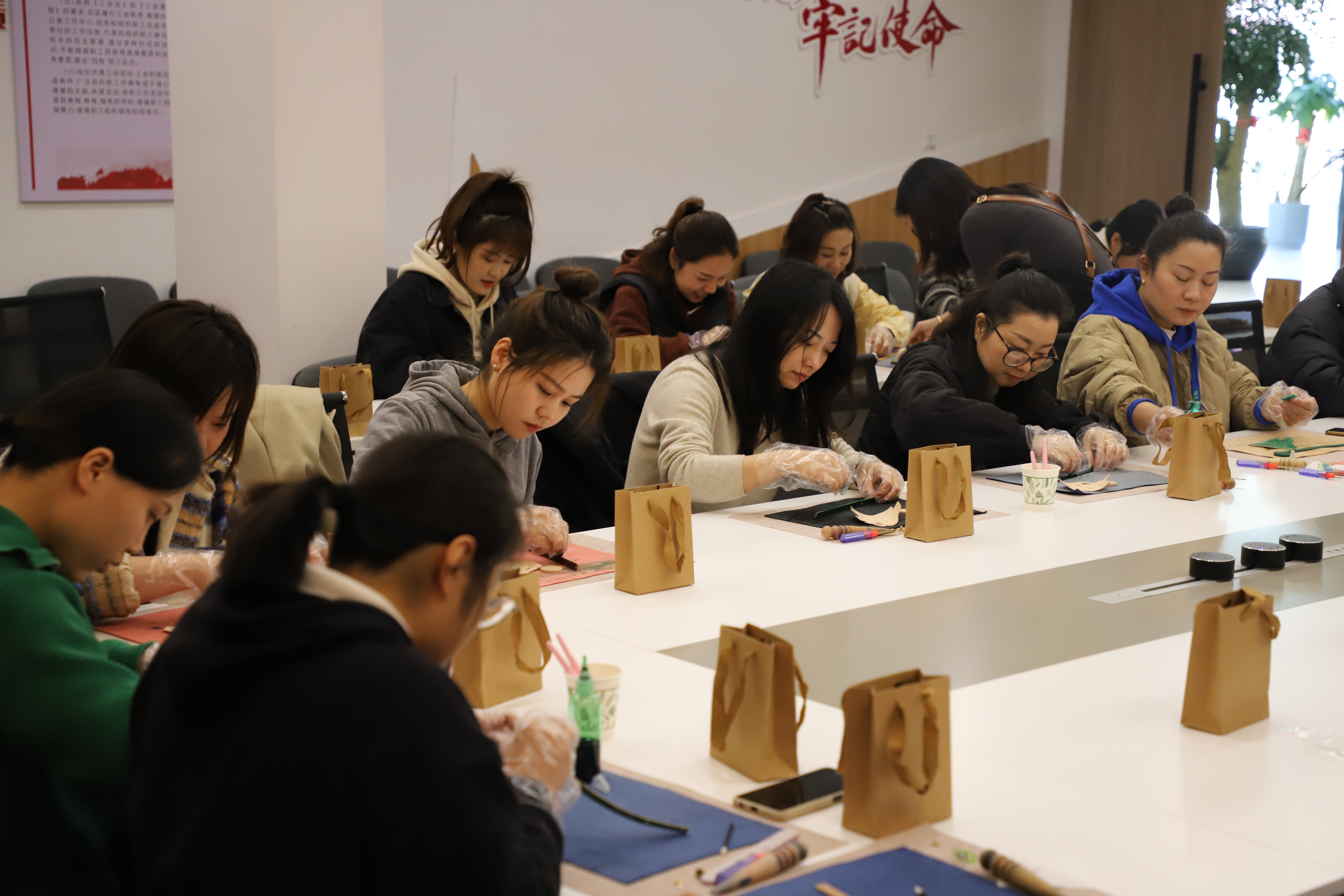 女职工们充分发挥心灵手巧的能力,按照老师的讲解,一步步制作,时不时互相讨论技巧,遇到不会的地方积极向老师询问讨教。最终,一个个漂亮精致的皮具完成了。大家纷纷表示感受到了节日的氛围和动手的乐趣。