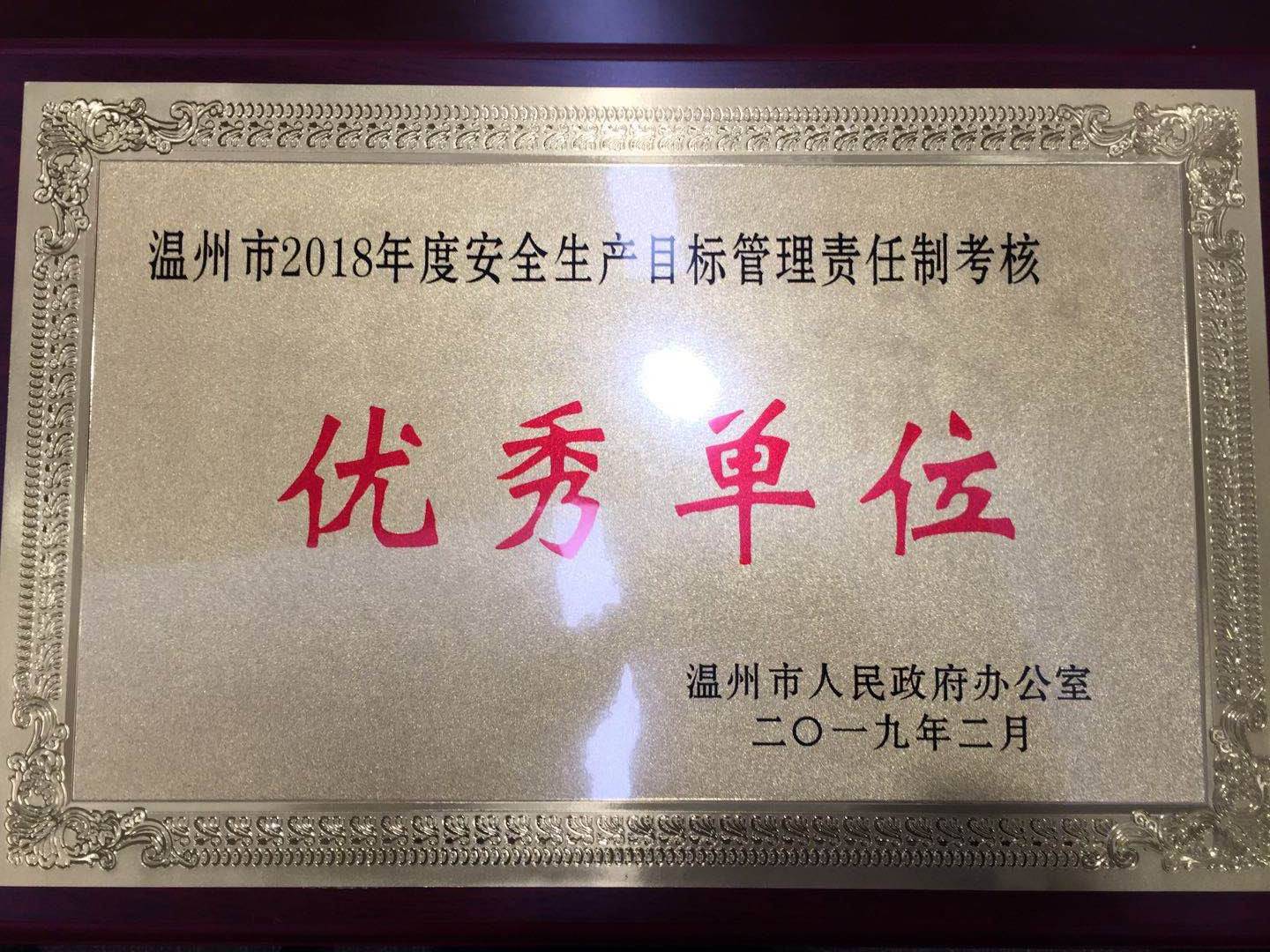 集团荣获温州市2018年度安全生产目标责任制考核“优秀单位”称号