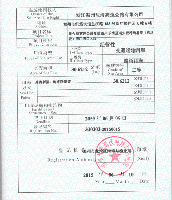 海域使用权证的获批为瓯江口跨海南大桥顺利施工提供了有力保障,也为本项目土地报批顺利报批打下了坚实的基础。