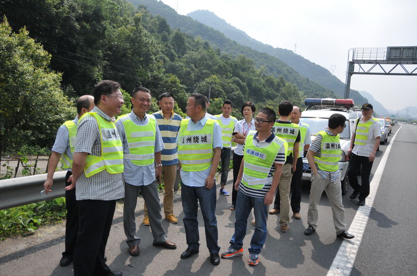 本次检查的重点针对温州大桥路灯加固工程和绕城K3处高边坡处置情况。在现场,王总仔细查看了两处病害隐患和相关单位应对高速公路高温气候的各项防护措施,并听取了工程公司总经理史海峰关于两处病害的实施方案和工程进度的情况汇报。