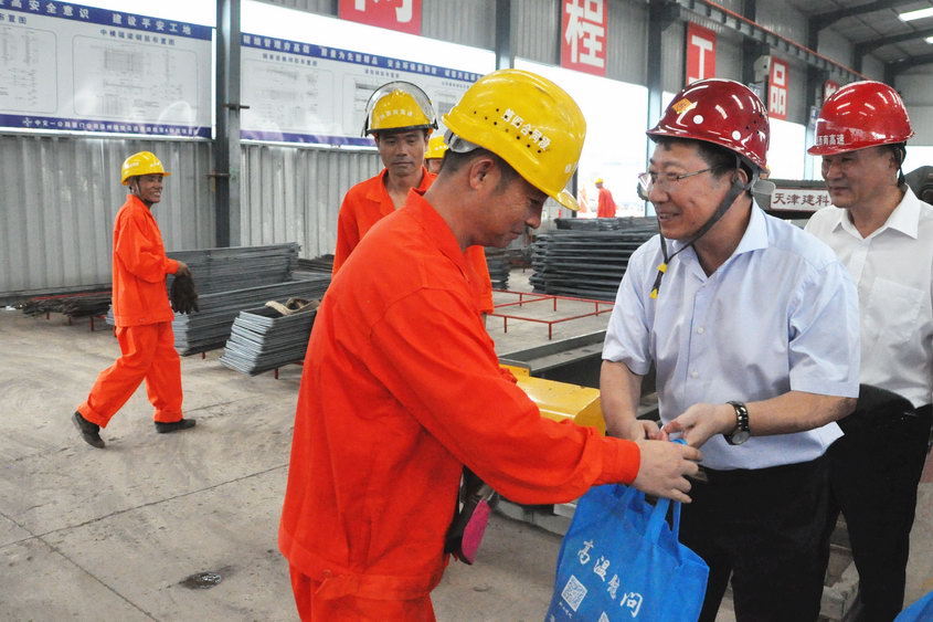 王益琪主席一行分别来到中交一公局绕西南工程第4标段钢筋加工厂、预制场、屏山隧道施工现场,实地了解一线建设们生产生活状况,每到一处王主席都亲自送上慰问品,与大家亲切交谈,并嘱咐大家要注意安全,防止中暑,王主席对大家远离家乡、不畏高温、奋斗在工程建设一线的精神给予了高度赞扬。此外,王主席还询问了施工队及班组劳动竞赛的开展情况,并对绕西南工程目前取得的成绩予以肯定,他要求各施工单位要建立健全防暑降温工作制度,切实落实错时作业制、及时发放高温费,切实做好的劳动安全防护工作。