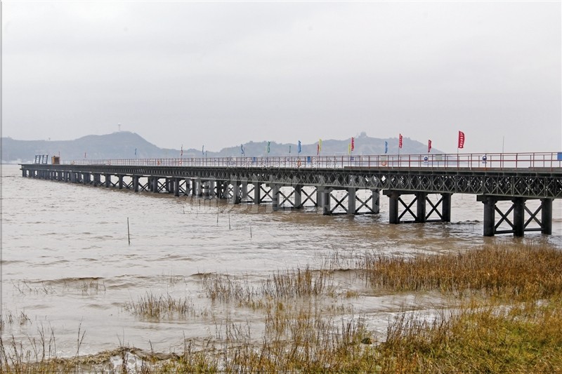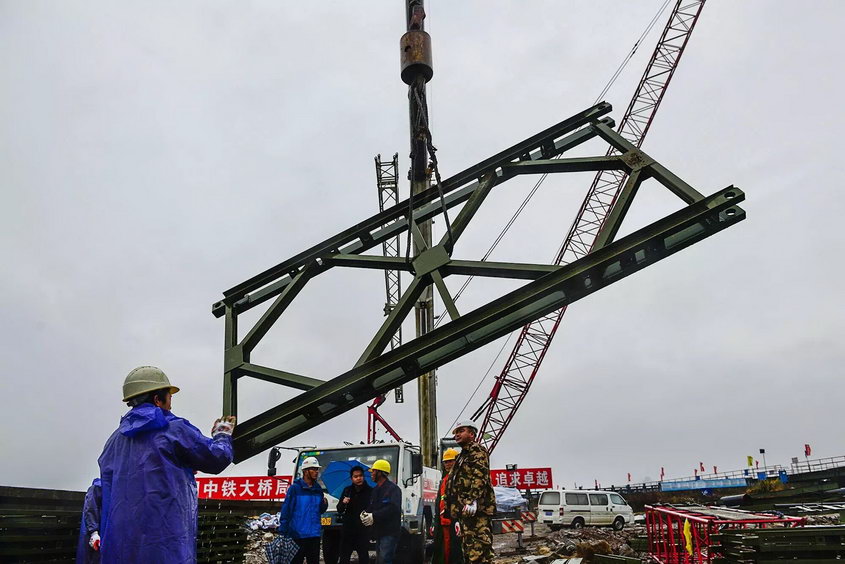 在瓯江北口大桥施工现场,四下荒凉空旷,冰雨刺骨,江风凛冽,工地一带的温度明显比市区低了好多度。在这样“不甚理想”的施工条件下,工地上却已经出现忙碌的身影。工人们戴着安全帽、穿着塑料雨衣,正在操作着一台起吊臂装卸钢铁架子。这些架子叫贝雷钢桥,是用它来搭建主桥墩的临建平台。据了解施工队正月初五已经复工,目前都在做一些前期准备工作。