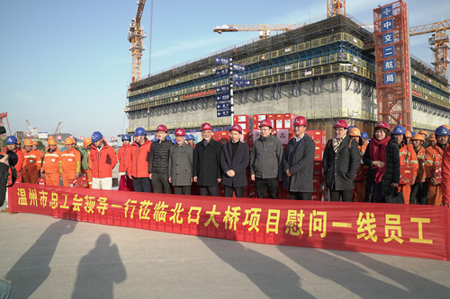 1月11日,市总工会党组书记、常务副主席程龙凤、副主席张红军一行来到温州瓯江北口大桥项目现场进行慰问调研,并现场指导工地联合工会及立功竞赛筹备布置工作。集团董事长秦肖,副总经理周列茅,工会主席王道川及瓯江口大桥公司郑锋利等人员陪同。