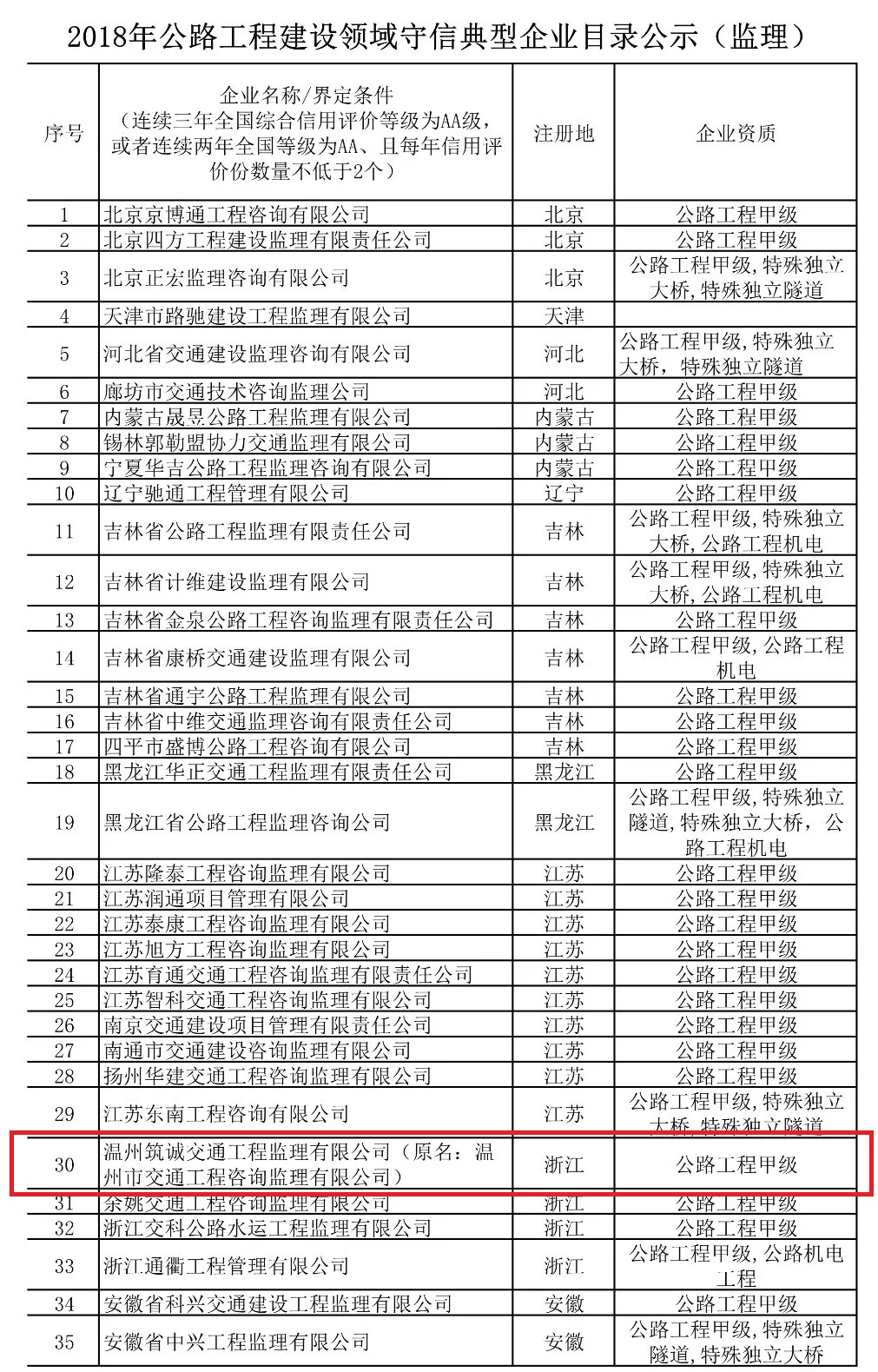 近日,交通运输部公示2018年公路水运工程建设领域守信典型企业目录。全国682家公路工程监理企业中上榜信用“红名单”的监理单位仅有49家,温州筑诚交通工程监理有限公司成为浙南地区唯一一家上榜的监理企业。