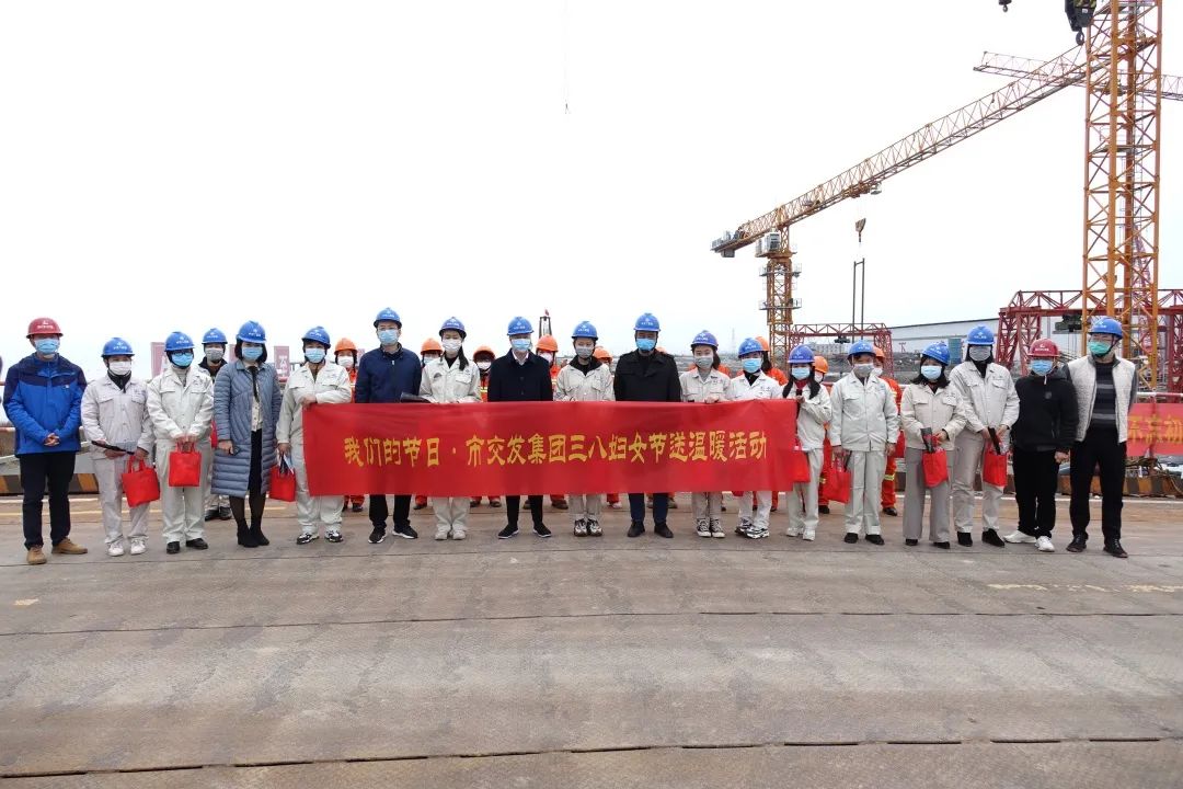3月6日,伟德国际victor1946总经理南品仁、总经济师、工会主席王道川、副总经理、总工程师郑锋利代表集团工会在瓯江北口大桥项目工地开展“三八”妇女节慰问活动,向奋战在工地一线的女职工送去节日的祝福。