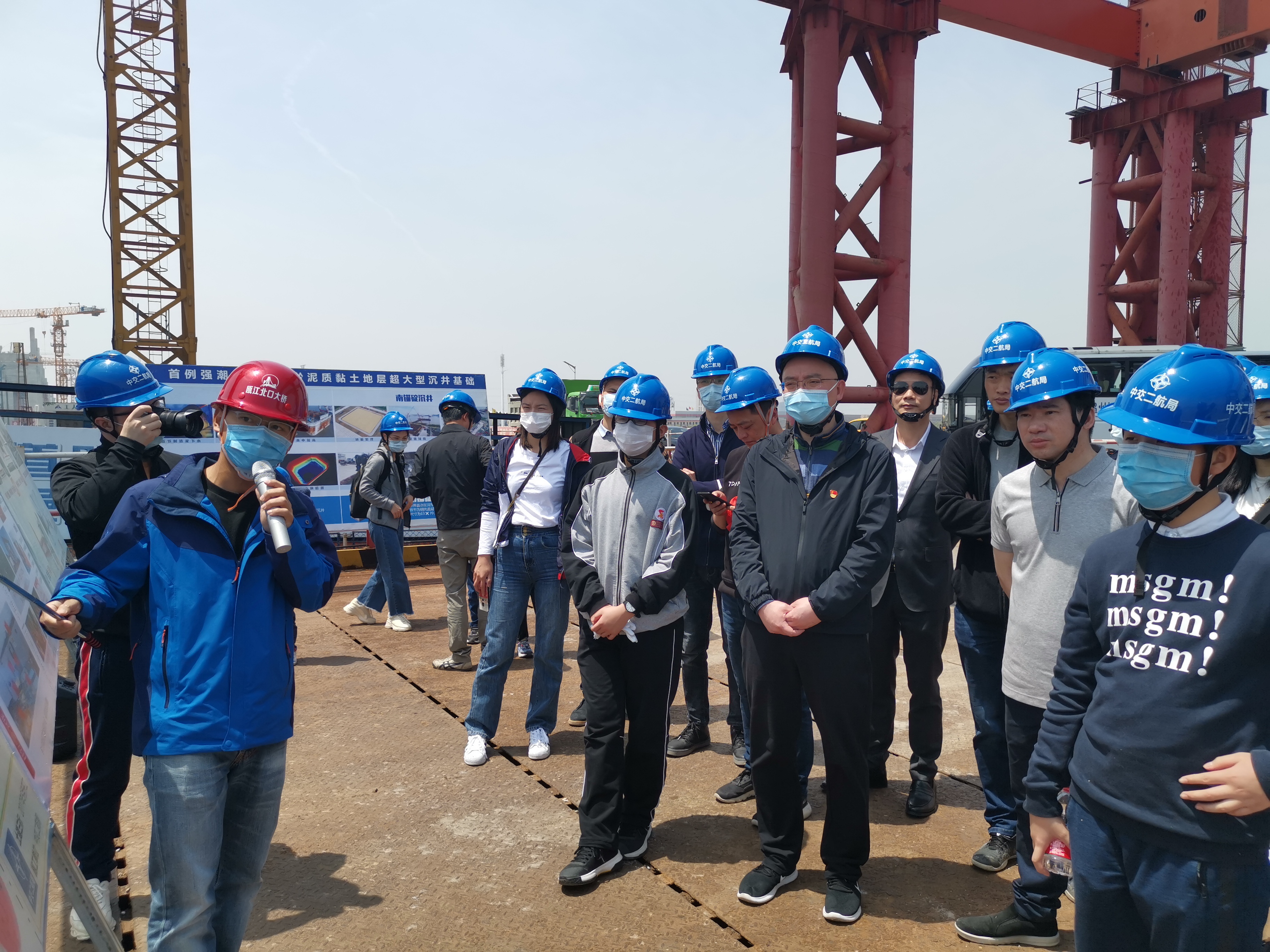 一行人来到项目南塔施工现场,听取了瓯江北口大桥项目整体概况、施工进展、党建及产业工人园等工作情况的汇报,实地查看了项目南塔、南锚碇等关键工程建设情况,并参观了项目党群服务中心及桥梁建设展示馆。