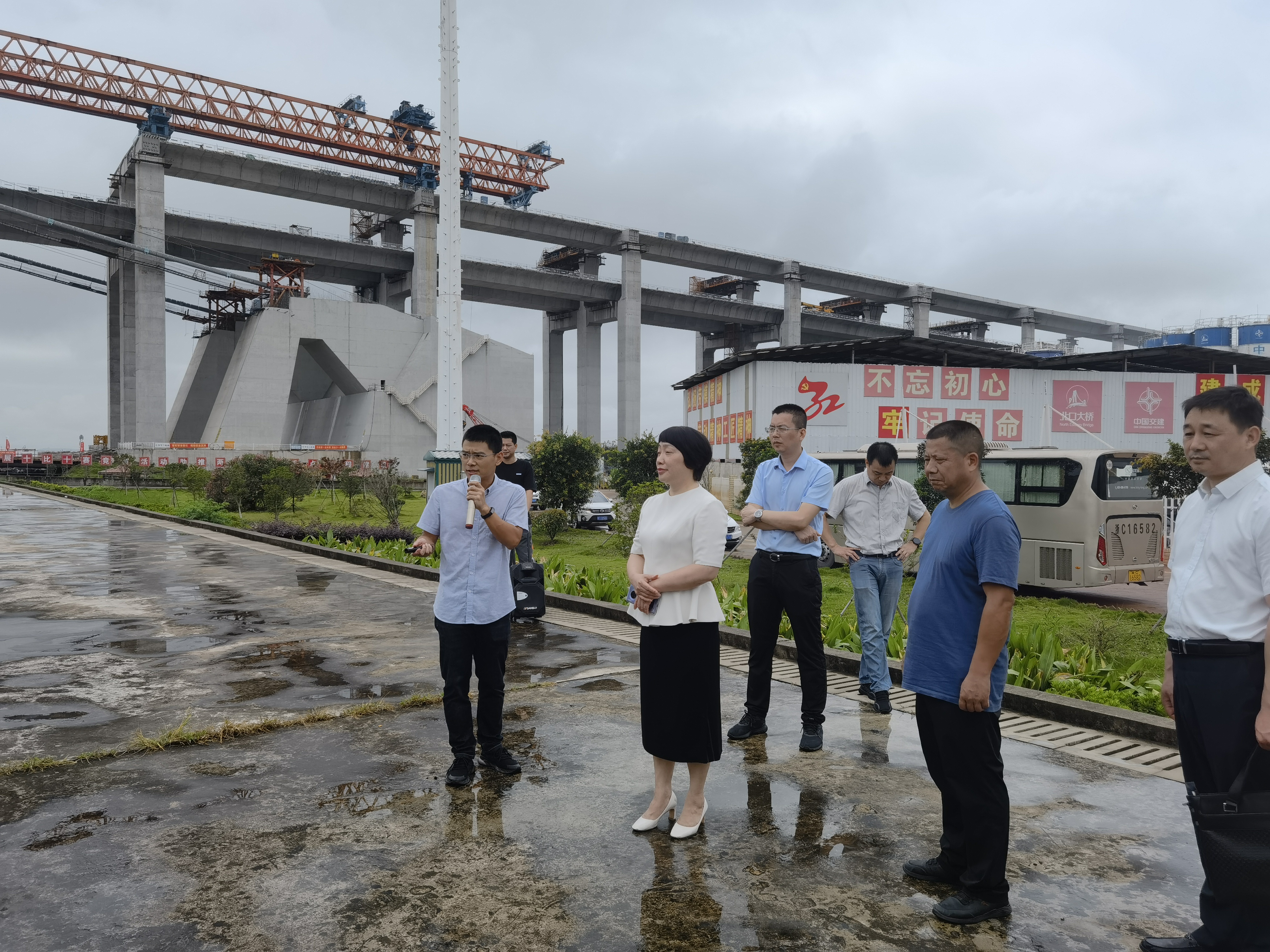 黄洁梅一行首先来到北口大桥项目现场,听取了关于项目建设进展、上部结构施工计划、技术难点、质量安全管控、温州瓯江北口大桥产业工人培育及“党建+重点工程”等情况的汇报。