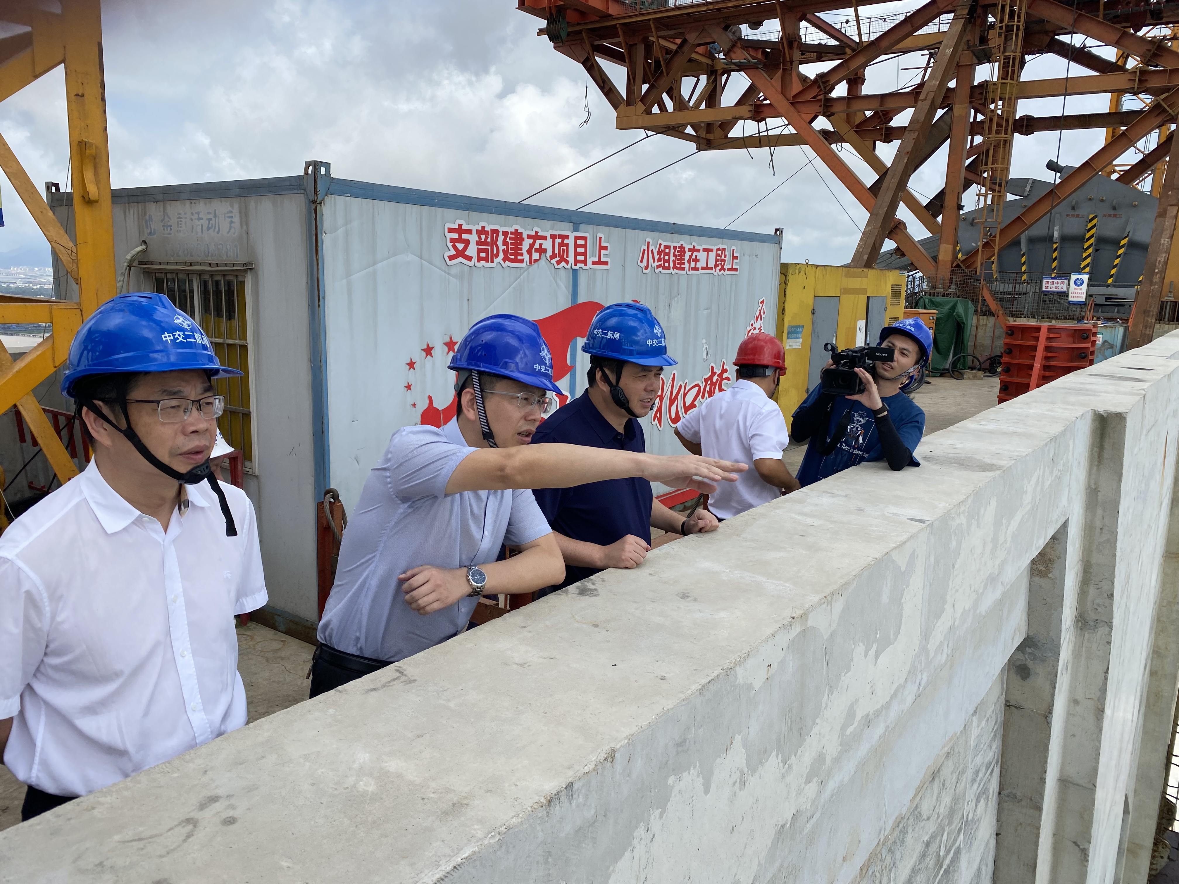 7月14日上午,乐清市市长徐建兵、常务副市长何学考一行莅临温州瓯江北口大桥项目施工现场开展调研工作,集团副总经理、总工程师郑锋利等陪同。