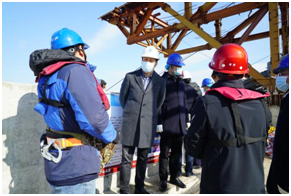 一行人来到项目一线施工现场,听取工程建设进度、技术创新的详细介绍,随后搭乘电梯登上项目南塔,深入调研项目上部结构施工,并仔细询问工程质量、安全管控情况。