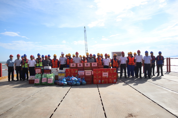 抵达3标施工现场后,集团领导一行细心查看了工作环境,详细了解了高温防护措施,亲切询问了工人们的作息时间和生活状况,对大家高温天气下坚守岗位、辛苦劳动的精神表示高度赞扬,反复叮嘱项目部要科学合理地做好高温情况下的岗位安排,严格执行及时换岗、合理休息的制度,避免员工因长时间作业而疲劳、中暑。随后,领导们将清凉饮料、防暑降温药品等慰问品送到工人手中,并叮嘱工人要注意生产安全,在努力工作的同时,也要照顾好自己的身体。